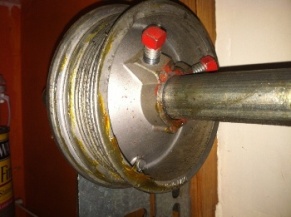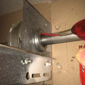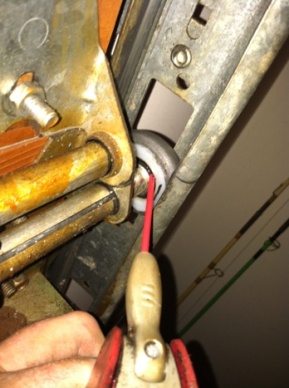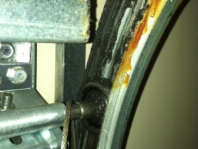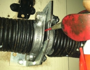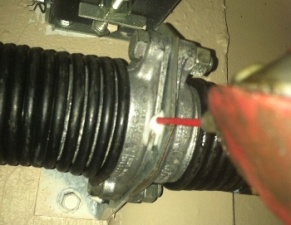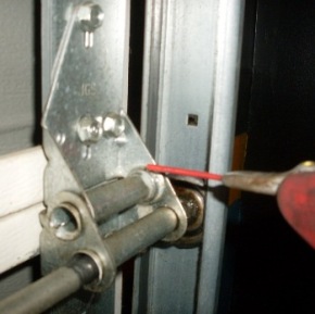 Not So Obvious But Very Important, The BearingsOnward to the bearings! We're almost done. If the door is closed you can see the springs and the bar they are mounted on about 10 to 12 inches over the top of the door. If you are not sure that you see them look at the "springs" page on this website, there are some pictures with descriptions of what you're looking at. The ends of this bar are supported by a plate that is attached to the track and has a bearing in it. You have to spray this bearing from "outside" of the tracks because the drum that the cable winds up on is right up against the other side of it. The pic on the left is to show you where to lubricate, in between the bearing parts rather than between the bearing and the tube. If you watch this while the door is moving you will see that the inner race of the bearing (part that is touching the tube) turns with the tube. It is very important to lube these bearings because they actually support the 250 to 300 pounds that your garage door weighs.