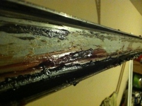 This next pair of hinges are used on two of the doors that Wayne Dalton manufactures. The doors feature a pinch resistant joint, which means if you are pulling the door down from the outside you can't smash your fingers in the joint. You need to shoot lube into these hinges until you see it come out the other side of the hinge. A reasonably short but full pressure shot will get the lube where it needs to be. When you see the lube coming out the far side of the hinge it is done.