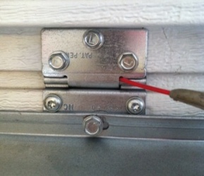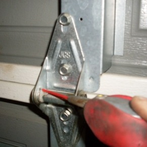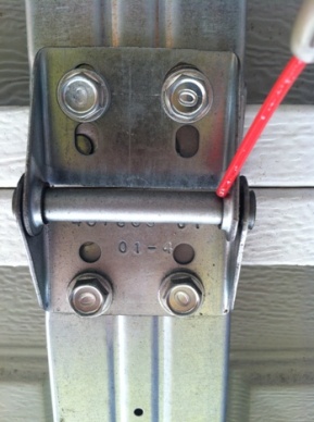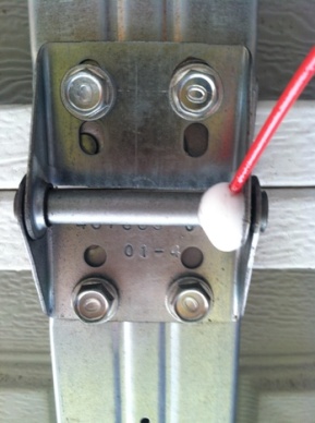 That concludes the section on roller lubrication. Hinges, The Next Step In The ProcessOur next exciting area of study is the hinges. Sounds exciting doesn't it? Sorry for the play on words, but for some people the lack of sound might be the exciting part. Almost all of the noise that a garage door makes as it goes up and down comes from the hinges and is resonated by the metal panels almost as if it was amplified. Lubrication of the hinges usually makes most of this noise go away. This may make your door quiet down a bit but realize if the hinges need lubrication the rest of the door needs it to. The hinges are just the parts that scream "oil can" (a poor Wizard of Oz reference) but the other points need lubrication too. These first two pics are what I would refer to as "normal" hinges. About 80% of the doors in our market have one of these two. All you need to do is put a little bit of lube on each end of the hinge pin as shown.
