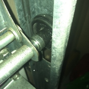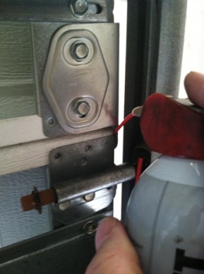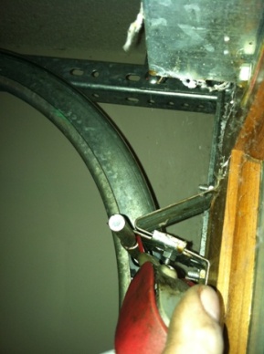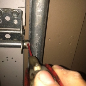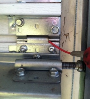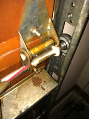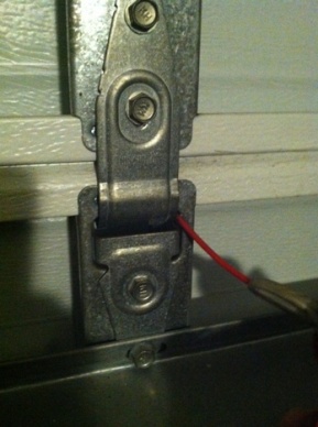 The next two hinges are the ultimate pinch resistant door. This means if you are pulling the door down from the outside you can't smash your fingers in the joint. It is an Amarr door and all of their doors have this design feature for the last 10 or 15 years. The left picture is the hinge on the end of the door. There is a pin that projects into the lower section of the door, on the side of the door. A quick shot of lube between the bracket and the door, where the pic shows, will take care of these hinge points. The next issue is the central hinges (the pic on the right). Unfortunately for you these are the hardest of all the hinges to lubricate because the actual hinge is up inside the door. Point the straw (you have to use a straw) up and center on the hinge and give it a full pressure blast. If the door doesn't quiet down try it again, these doors usually respond well to lubrication.