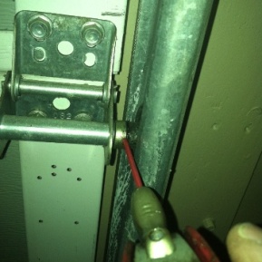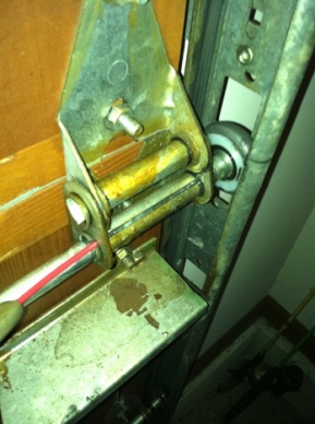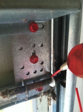 The second pair of hinges are characteristic of most of the doors manufactured by Overhead Door Company. The hinge pin is smaller but responds to lube the same way. In the picture on the left the lube straw is in position, right where the pin meets the ring of the hinge. A very controlled finger can cause just a little bit of oil to come out of the can (shown on the right), and then it will naturally wick into the parts that it needs to lubricate.